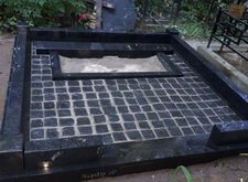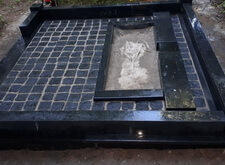Так выглядит окончательный вариант места захоронения: памятники являются точной зеркальной копией друг друга, на землю уложена брусчатка, металлическое ограждение заменено на гранитный цоколь.